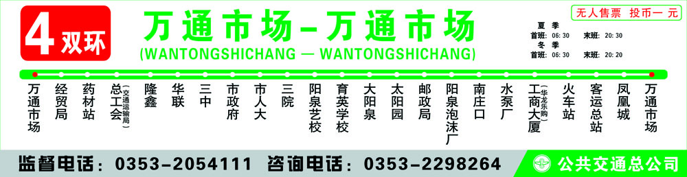 萬通市場 - 經貿局–藥材站 - 總工會(交通運輸局)- 隆鑫 - 華聯(lián) - 三中 - 市政府 - 市人大 - 三院 - 陽泉藝校 - 育英學校 - 大陽泉 - 郵政局(太陽園) - 陽泉 泡沫廠 - 南莊口 - 水泵廠 - 工商大廈(華龍樂購) - 火車站 - 客運總站 - 鳳凰城 - 萬通市場
